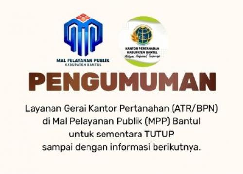 Layanan Gerai Kantor Pertanahan (ATR/BPN) yang berada di Mal Pelayanan Publik (MPP) Bantul untuk sementara TUTUP hingga pemberitahuan lebih lanjut. Bagi masyarakat yang membutuhkan layanan pertanahan (Konsultasi dan Perizinan Pertanahan terkait Pertimbangan Teknis Pertanahan), dapat langsung datang ke: Kantor Pertanahan Kabupaten Bantul Jl. Ringroad Timur, Manding, Trirenggo Telepon: ...