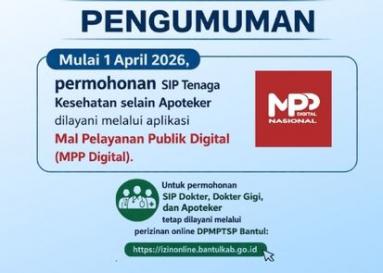 30 April 2022 - Telp.0274 367867/email: dpmptsp@bantulkab.go.id/ WA:0813 2884 8393 /WA OSS pusat : 0811 6774 642 . / 04 Maret 2025 - Semua permohonan SIP Tenaga kesehatan yang telah memiliki STR seumur hidup, selain Bidan dan Apoteke . /