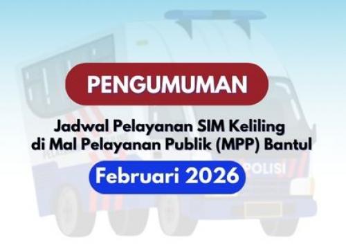 Jadwal layanan SIM Keliling di MPP Bantul selama bulan Februari 2026 di setiap hari Selasa. Di luar tanggal pelayanan tersebut silakan datang ke Satpas Polres Bantul / lokasi SIM Keliling lainnya. Ambil nomor antrian di mesin antrian lewat pintu masuk barat gedung MPP Bantul. Kuota pelayanan 30 orang. Persyaratan : * KTP dan SIM asli * Fotokopi KTP dan SIM (rangkap 2) * Surat ...