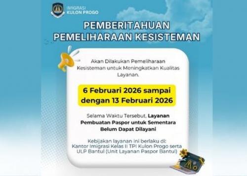 Dalam rangka pemeliharaan dan peningkatan kesisteman, layanan pembuatan paspor untuk sementara tidak dapat dilayani pada 6 Februari 2026 sampai dengan 13 Februari 2026, sehingga ULP Bantul (Unit Layanan Paspor Bantul) di Mal Pelayanan Publik (MPP) Bantul belum dapat melayani pembuatan paspor pada tanggal tersebut. Untuk informasi, konsultasi dan pengambilan paspor masih dilayani seperti ...