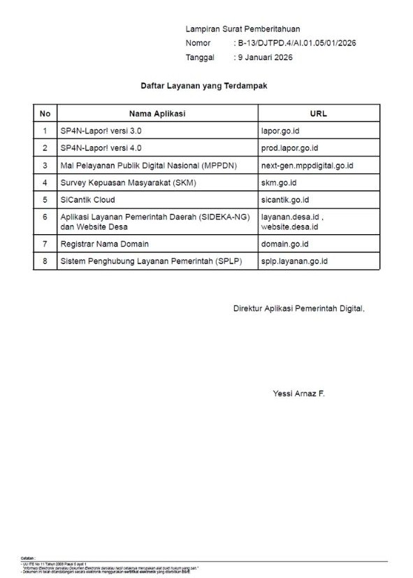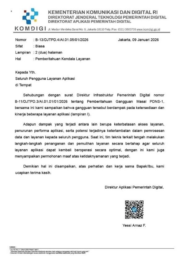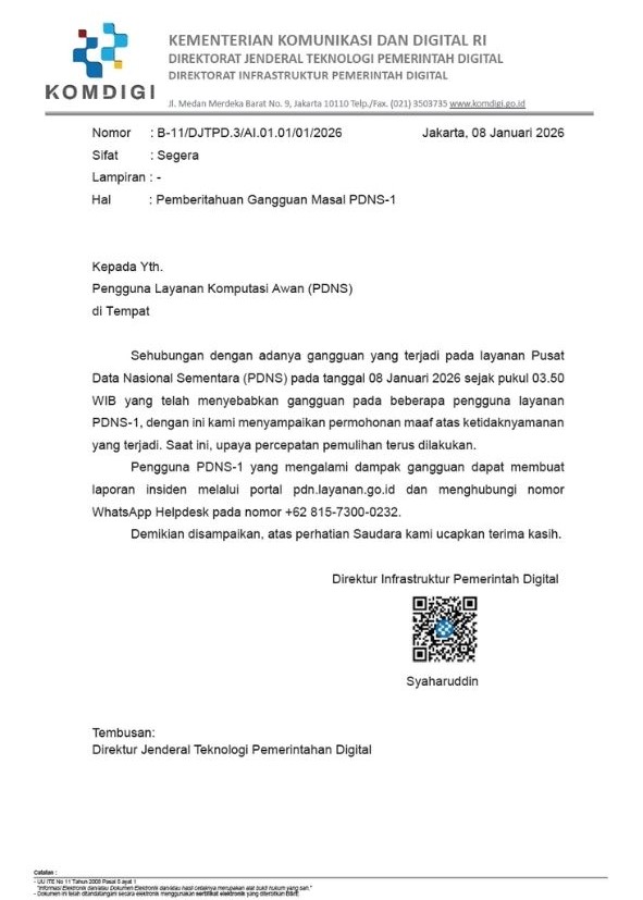 Saat ini, tim teknis terkait sedang melakukan langkah-langkah penanganan dan pemulihan layanan secara bertahap agar seluruh layanan dapat kembali beroperasi secara optimal.