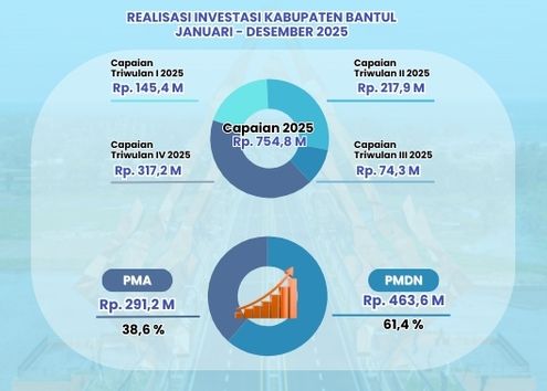 Sepanjang tahun 2025, Kabupaten Bantul telah mencatatkan kinerja investasi yang sangat positif, dengan dilihat dari total realisasi investasi yang mencapai Rp 754,8 miliar, atau telah tercapai 177,62% dari target yang telah ditetapkan Kementerian Investasi dan Hilirisasi/BKPM. Hal ini mencerminkan semakin kuatnya daya saing dan kepercayaan investor terhadap Bantul.