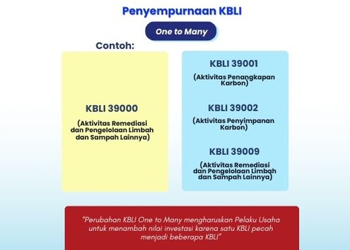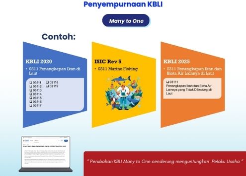 Penyempurnaan Klasifikasi Baku Lapangan Usaha Indonesia (KBLI). Penyesuaian dilakukan melalui mekanisme many to one, yaitu beberapa KBLI yang digabung menjadi satu izin, serta one to many, yaitu satu KBLI yang dapat mencakup berbagai aktivitas usaha.
