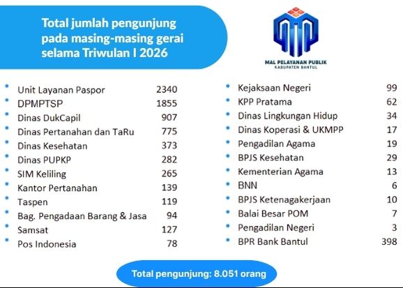 Di sepanjang Triwulan I tahun 2026 (Januari - Maret 2026), telah 8 ribu lebih orang yang memanfaatkan berbagai layanan di Mal Pelayanan Publik (MPP) Bantul.