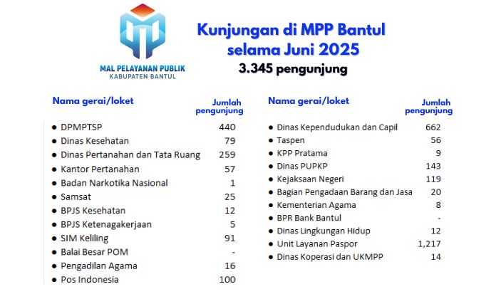 Selama Juni 2025, Mal Pelayanan Publik (MPP) Kabupaten Bantul telah dikunjungi oleh 3.345 orang untuk mengurus berbagai keperluan layanan publik.